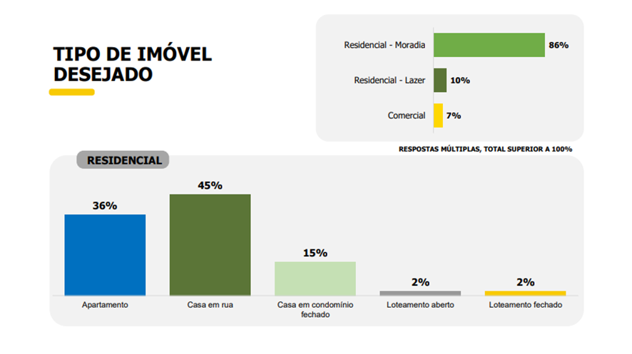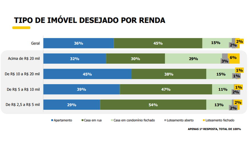 Entre os entrevistados com renda mensal superior a R$ 20 mil, o tipo de imóvel mais desejado é o apartamento (32%), embora as preferências por casas em rua (30%) e em condomínios fechados (29%) estejam praticamente empatadas. Já entre as famílias com renda entre R$ 2,5 mil e R$ 5 mil, a casa em rua continua a se destacar como a principal escolha.